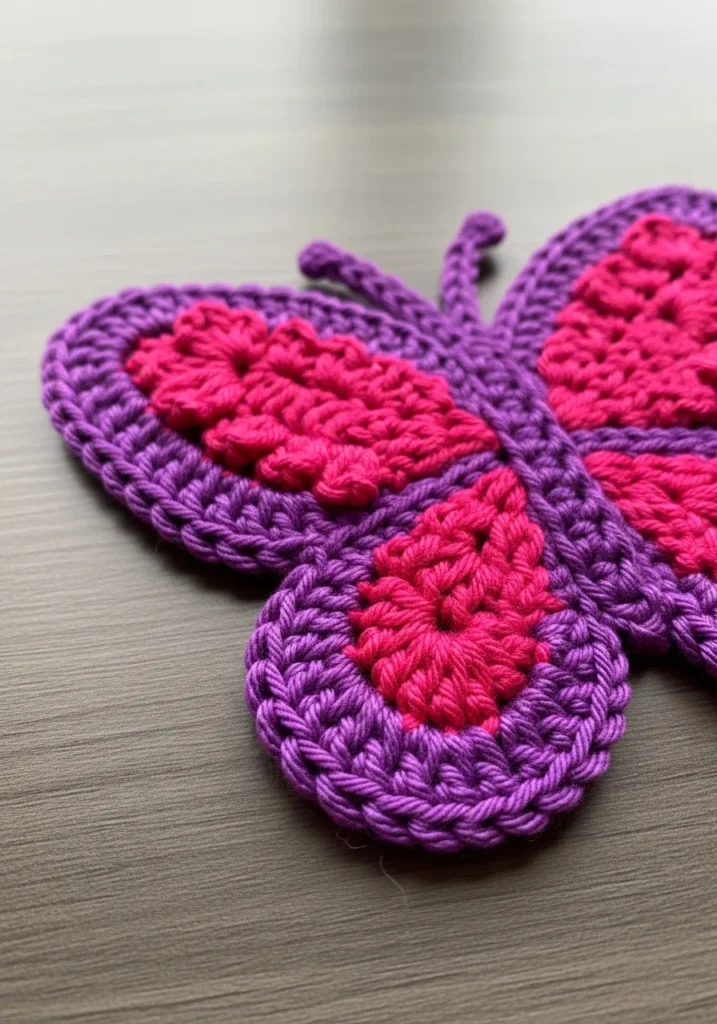 This vibrant butterfly applique pops in bold pink and purple yarn with layered wings and raised stitch details. The rounded wing shapes and contrasting center give it a sweet dimensional look, and the slightly textured stitches add personality and charm. It is flat enough to sew onto almost anything, yet detailed enough to stand on its own.