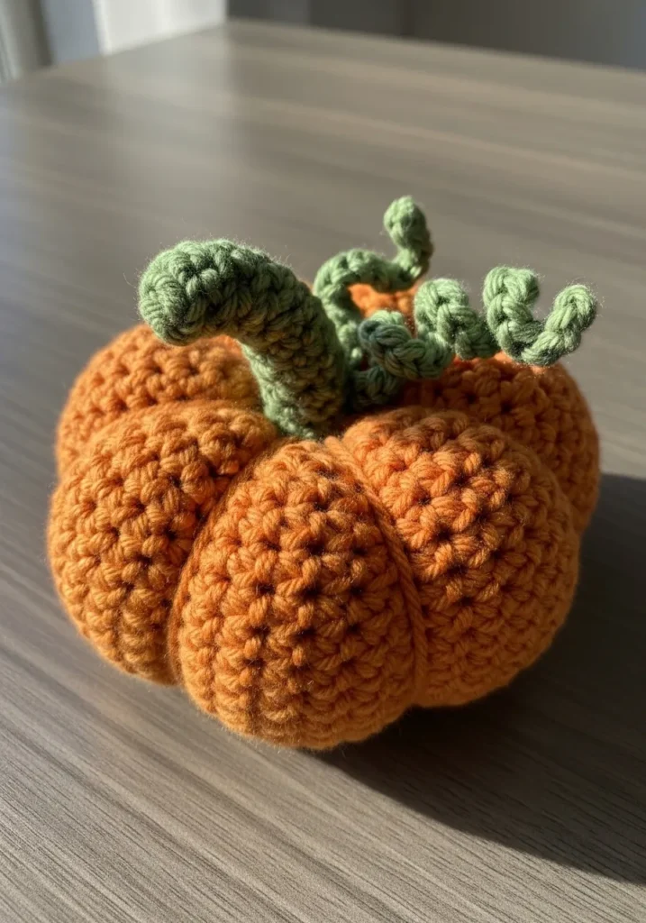This plump little crochet pumpkin is stitched in warm orange yarn with soft ridges that mimic real pumpkin grooves. The curly green stem adds a playful twist, and the slightly uneven shaping gives it that authentic handmade feel. The texture is cozy and perfect for fall styling.