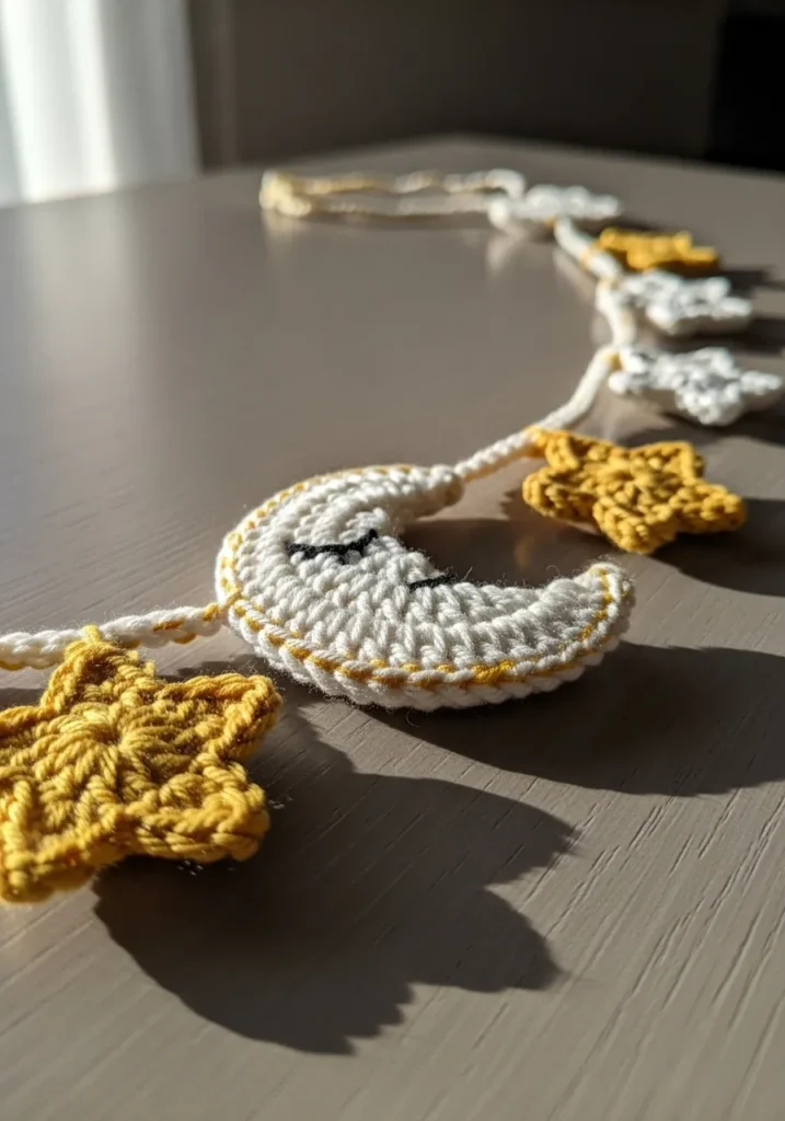 This delicate crochet garland showcases a soft cream crescent moon paired with golden star motifs. The pieces are lightly textured with visible stitch definition, and they are connected by a simple chain that keeps the look airy and whimsical. The shapes are sweet and dreamy without feeling overworked.