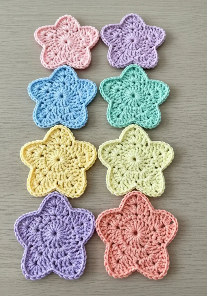 These soft crochet flower coasters are made in cheerful pastel shades like lavender, mint, baby blue, pale yellow, and peach. Each coaster has five rounded petals and a neat circular center that gives them a slightly dimensional look. The stitches are simple and even, creating a clean floral shape that lays flat on the table. The cotton yarn gives them a smooth finish and makes them sturdy enough for everyday use.