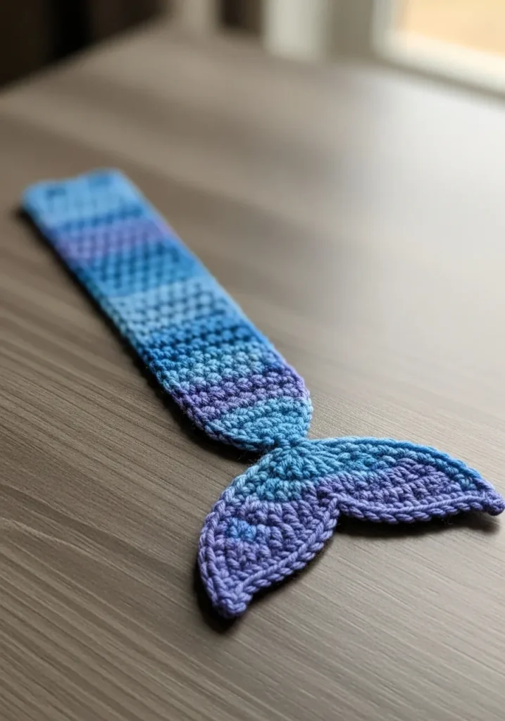 This slim crochet bookmark is shaped like a tiny mermaid tail and worked in beautiful shades of blue and purple. The body is long and flat with neat rows of stitches that create a subtle striped effect. At the bottom, the tail flares out into a small fin with gentle shaping that gives it that classic mermaid look. The yarn has a soft sheen that catches the light just enough.