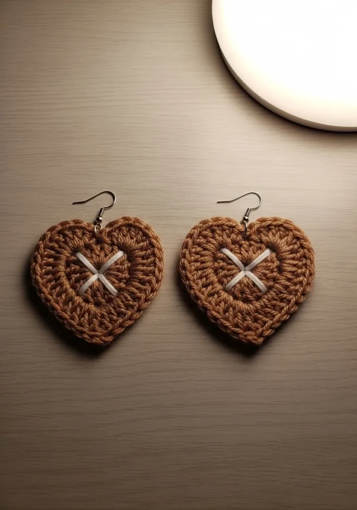 These darling heart earrings feature a rich cinnamon brown yarn that feels cozy and rustic. The design is built using classic crochet stitches worked in the round to create a sturdy yet lightweight heart shape. To add a bit of personality, a crisp white “X” is cross-stitched right into the center of each piece. They are finished with simple silver-toned fishhook wires, making them a perfect handmade accessory that balances a boho vibe with a clean, modern aesthetic.