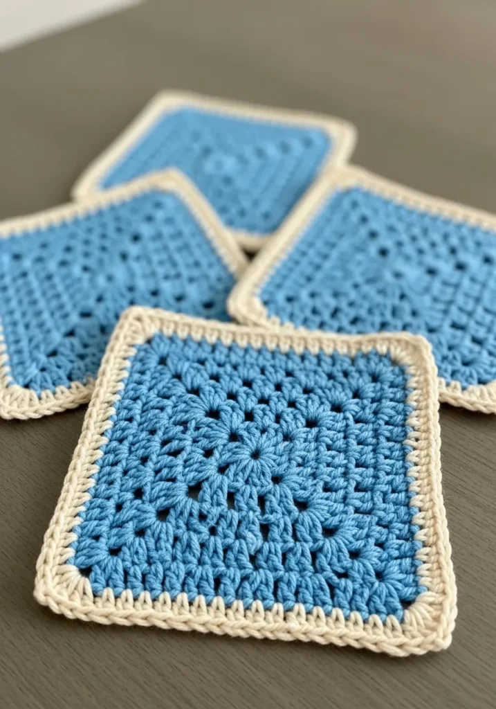 These charming crochet squares feature a classic granny design worked in a serene sky blue cotton yarn. The pattern radiates from the center with clusters of stitches that create a beautiful geometric texture, making them a gorgeous addition to a gallery wall or a cozy craft room. Each piece is framed by a delicate cream border that adds a clean and polished finish to the soft, woven fabric. The combination of the cool blue tones and the natural off-white trim gives these squares a timeless, cottagecore aesthetic that feels both nostalgic and modern at the same time.