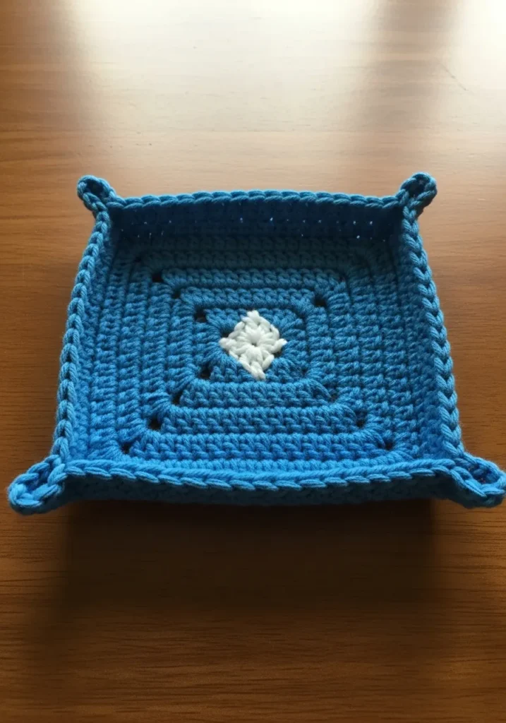 This adorable little valet tray features a classic granny square base that transitions into sturdy upright walls to hold all your trinkets. The design uses a vibrant cerulean blue yarn with a crisp white diamond center for a pop of contrast. The texture is thick and structured, thanks to the tight stitches, and the corners are finished with cute little loops that give it a unique, flared silhouette. It is the perfect size for holding jewelry on a nightstand or keeping your stitch markers and spare buttons in one place on your craft table.