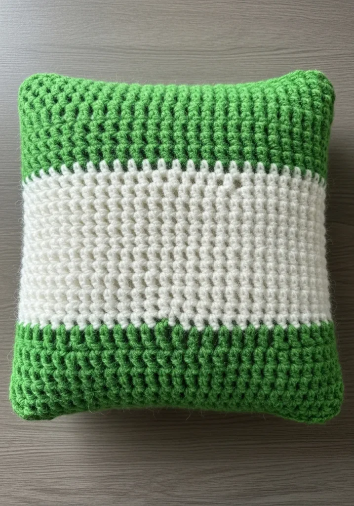 This adorable throw pillow features a classic three-stripe design that brings a fresh pop of color to any room. It is worked up in a vibrant lime green and a soft creamy white using a sturdy worsted weight yarn. The texture is thick and squishy thanks to the simple single crochet stitches, which create a dense and durable fabric. It has that perfectly rustic handmade feel that looks amazing tossed on a neutral sofa or tucked into a cozy reading nook. The clean lines and bold color blocking give it a modern vibe while keeping things totally snuggly.
