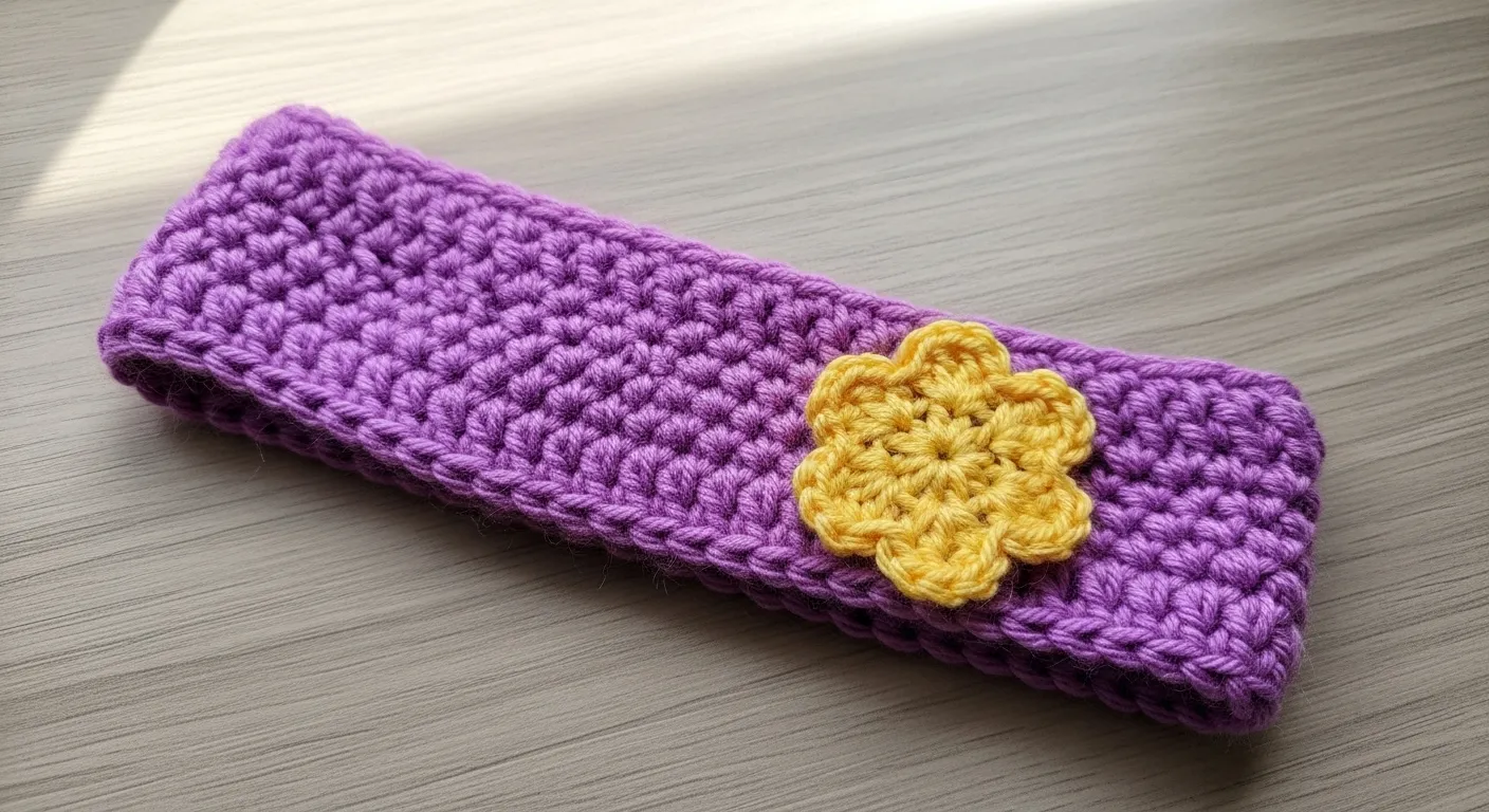 This charming headband features a rich purple hue that feels wonderfully cozy and vibrant. The yarn has a slightly chunky weight, giving the piece a lovely squishy texture that stays perfectly in place on your head. The design is clean and simple, focusing on a solid band of uniform stitches that show off your tension beautifully. To top it all off, a cheerful yellow crochet flower is securely attached, featuring layered petals that give the accessory a fun and dimensional look. It is a stylish way to keep your hair back while adding a bit of handmade flair to a casual outfit.