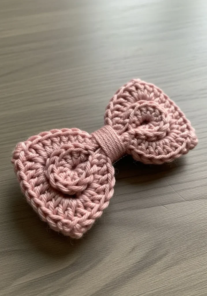 This soft pink crochet bow features symmetrical loops and a neatly wrapped center band that holds everything together. The stitches are slightly textured, giving it a cozy handmade look. It is small, lightweight, and perfect as a hair accessory or gift topper.