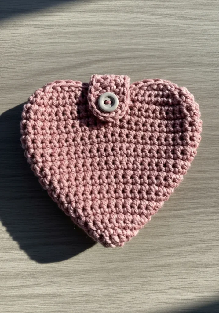 This blush pink crochet heart is worked in tight, even stitches with a small flap and button closure at the top. The rounded edges give it a soft, cozy look, and the compact design makes it practical for coins or tiny keepsakes. The texture is smooth yet slightly plush, which makes it feel sturdy but still sweet.