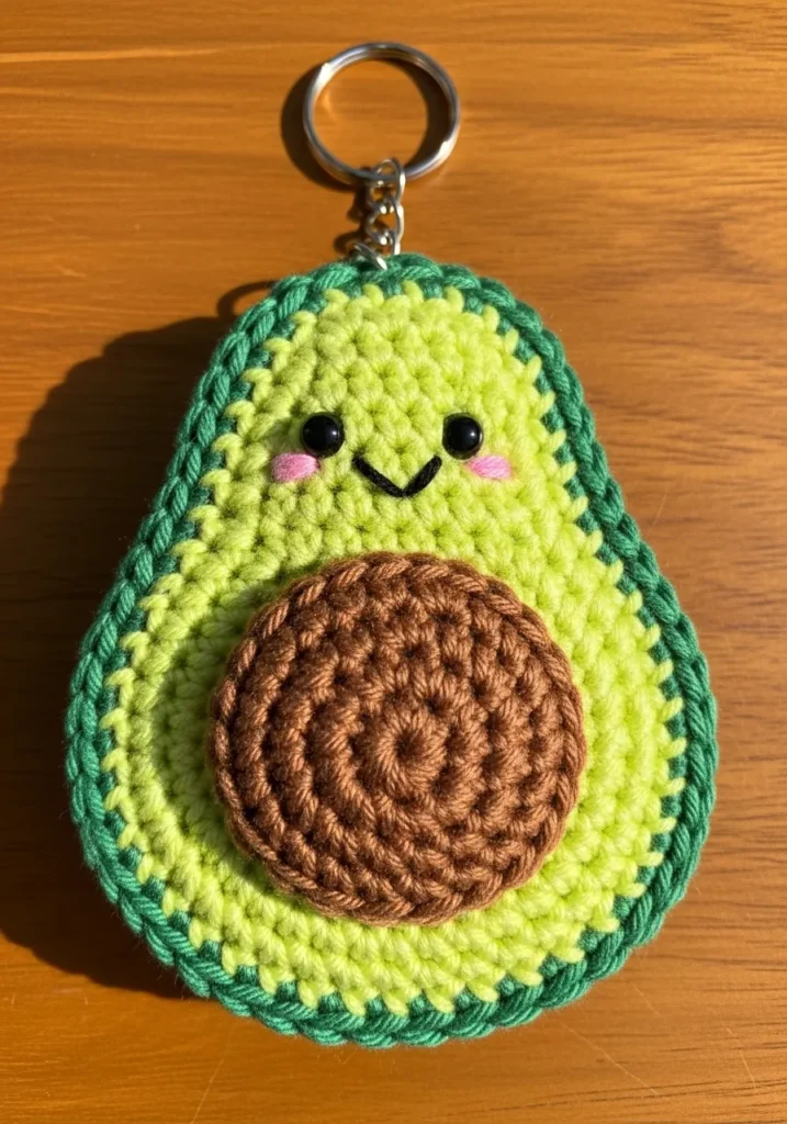 This adorable crochet avocado keychain is made with layered green yarn and a textured brown pit stitched right in the center. The tiny embroidered smile and blush cheeks give it that sweet kawaii vibe, and the small metal ring at the top makes it ready to clip onto a bag. The stitches are tight and rounded, giving it a soft yet structured shape.
