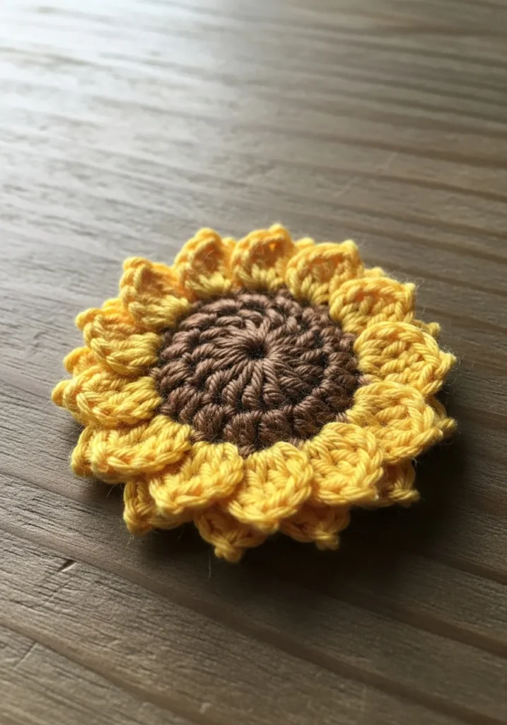 This crochet sunflower features a rich brown center surrounded by layered golden yellow petals that pop beautifully against a neutral background. The petal stitches add dimension and slight texture, making it feel lively and full. It lays flat, which makes it perfect for decorating bags, jackets, or even a simple hoop.