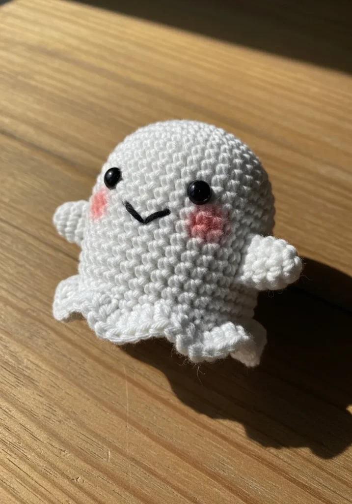 This small white crochet ghost has rounded arms, a scalloped bottom edge, and the cutest embroidered smile with pink cheeks. The smooth stitches give it a clean look, while the slightly puffy shape makes it extra huggable. It is compact enough to sit on a desk or shelf without taking up much space.