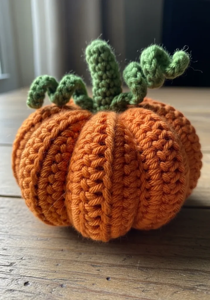This cozy crochet pumpkin features rich orange yarn worked in thick vertical ridges that give it beautiful texture and dimension. The plump shape is finished with curly green stems that twist playfully at the top. The chunky stitches make it feel warm and rustic, perfect for a seasonal touch that still stays small and quick to complete.