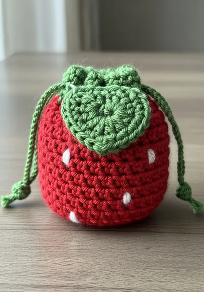 This vibrant red crochet pouch is shaped like a strawberry, complete with a green leafy top and small white seed stitches scattered across the body. The rounded base gives it structure, while the drawstring closure keeps it functional and secure. The texture is slightly bumpy from the seed details, which adds to the charm.