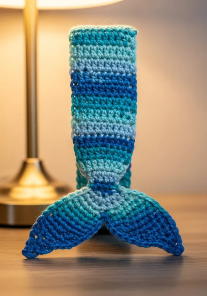 This crochet mermaid tail bookmark features flowing shades of blue that blend from light to deep ocean tones. The tail flares out at the bottom with defined fin stitches that add lovely texture and movement. Its slim shape makes it perfect for slipping between book pages without bulk.