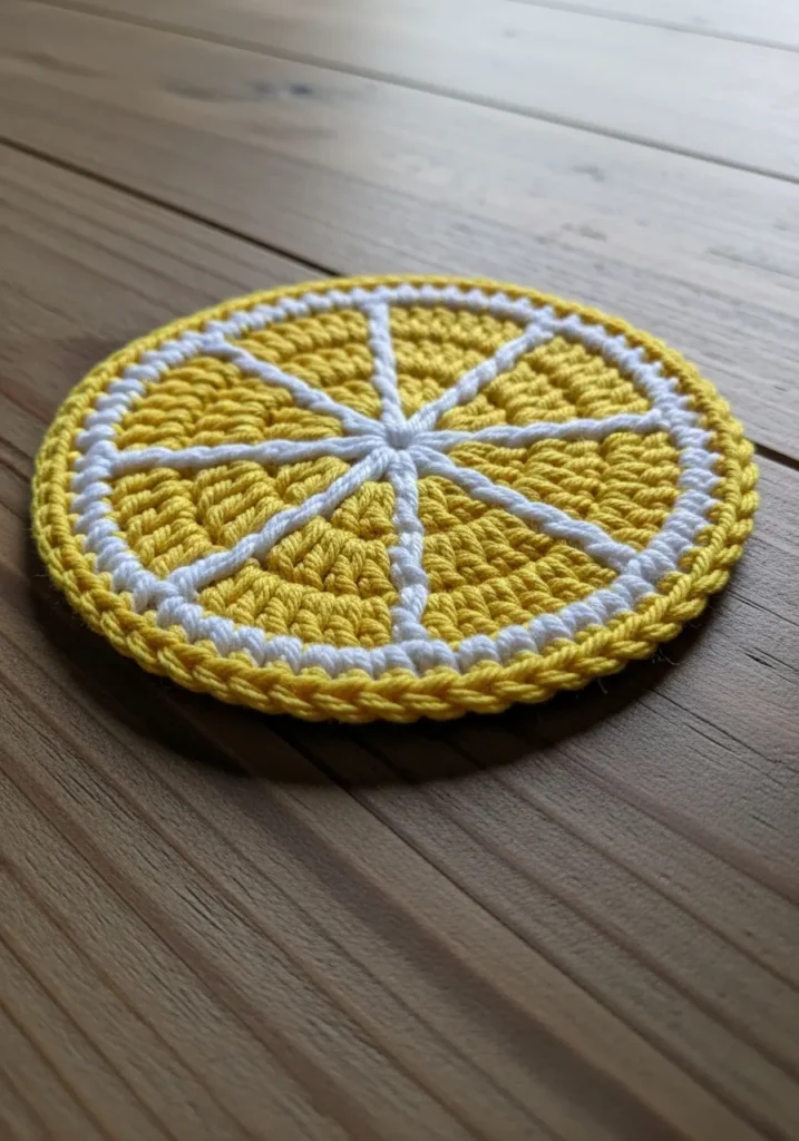 This bright yellow crochet coaster is designed like a fresh lemon slice, with white segment lines stitched from the center outward. The round shape and layered colors create a juicy, eye catching look, while the tight stitches keep it sturdy and flat. It is cheerful and functional at the same time.