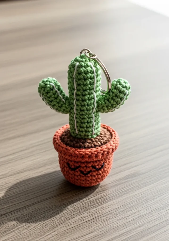 This tiny crochet cactus sits inside a small terra cotta colored pot, complete with textured green arms reaching upward. The stitches are snug and rounded, giving the cactus a soft sculpted look. The little pot adds structure and contrast, making the whole piece feel complete and decorative.