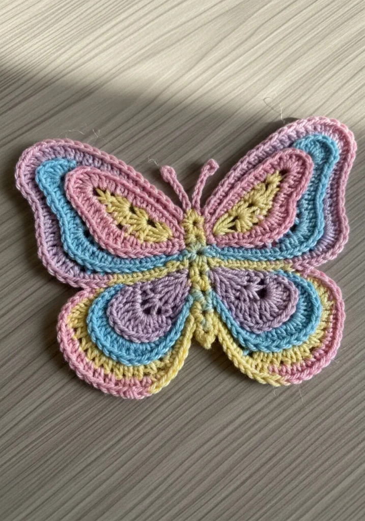 This delicate crochet butterfly is layered in soft pink, blue, yellow, and green yarn, creating a gentle pastel rainbow effect. The wings have defined stitch patterns that give them subtle texture and depth, while the small body and antennae keep the design light and balanced. It lays flat beautifully, making it perfect as an applique or decorative accent.
