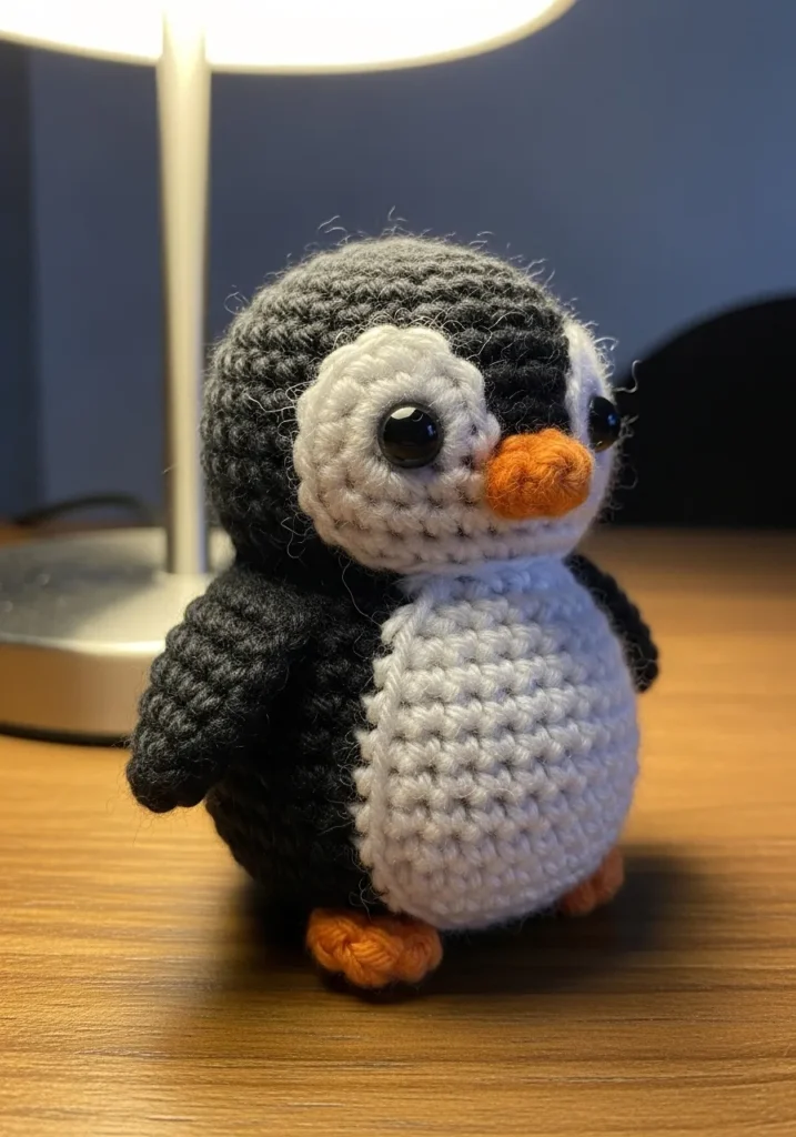 This adorable crochet penguin is crafted in classic black, white, and bright orange yarn with a rounded belly and tiny beak. The tight stitches give it a firm, structured look while the small wings and stubby feet add charm. Its compact size makes it a perfect desk buddy or small handmade gift.