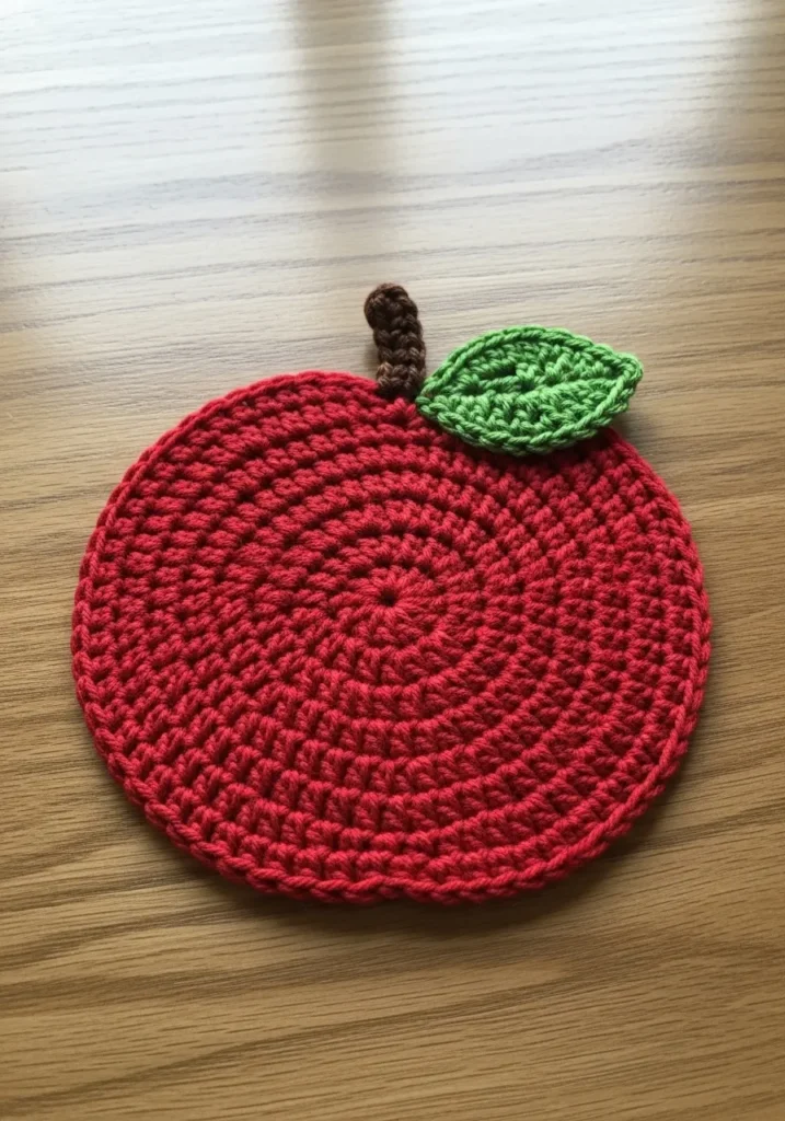 This cheerful crochet apple is worked in vibrant red yarn with a small green leaf and brown stem stitched at the top. The circular shape and spiral stitch pattern create a subtle texture that feels both sturdy and decorative. It is flat, functional, and still full of personality.