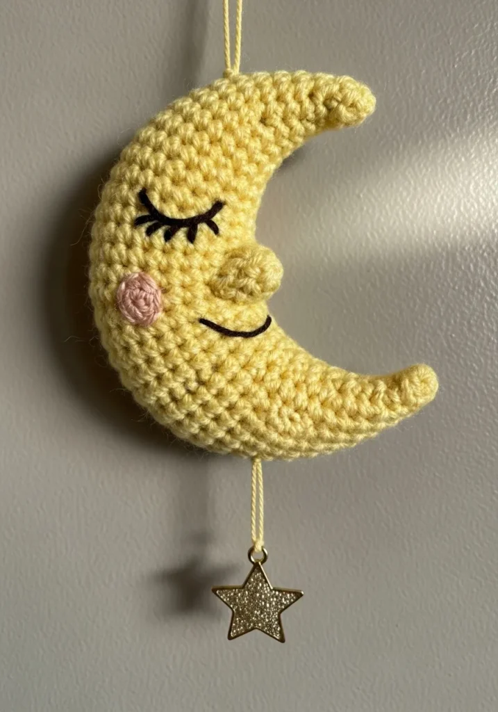 This soft yellow crochet crescent moon features an embroidered closed eye and rosy cheek for a dreamy expression. A tiny star charm dangles below, adding a whimsical touch to the smooth, rounded shape. The stitches are neat and slightly plush, giving it a cozy, handmade feel.