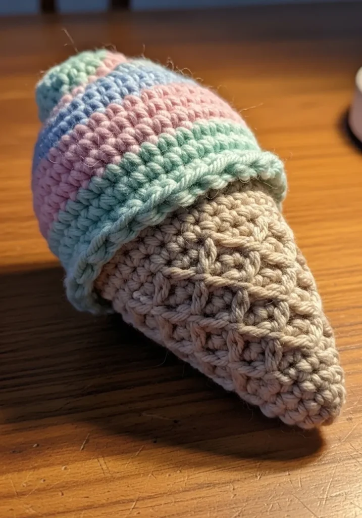 This playful crochet ice cream cone has a soft beige cone base with textured stitches and a pastel striped scoop on top. The rounded shape and layered colors give it a sweet, whimsical feel. It is compact and lightweight, making it an adorable little display piece.