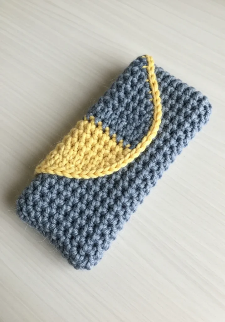 This chic little accessory features a beautiful slate blue body worked in a dense and protective moss stitch for a soft yet sturdy feel. The highlight is a bright buttery yellow flap shaped like a half-moon that folds over the top and is finished with a pretty scalloped edge. The texture is pleasantly tactile and thick enough to keep delicate lenses safe from scratches while looking like a tiny work of art. Its slim and compact design makes it the perfect size for slipping into a side pocket or a small crossbody bag without taking up too much room.