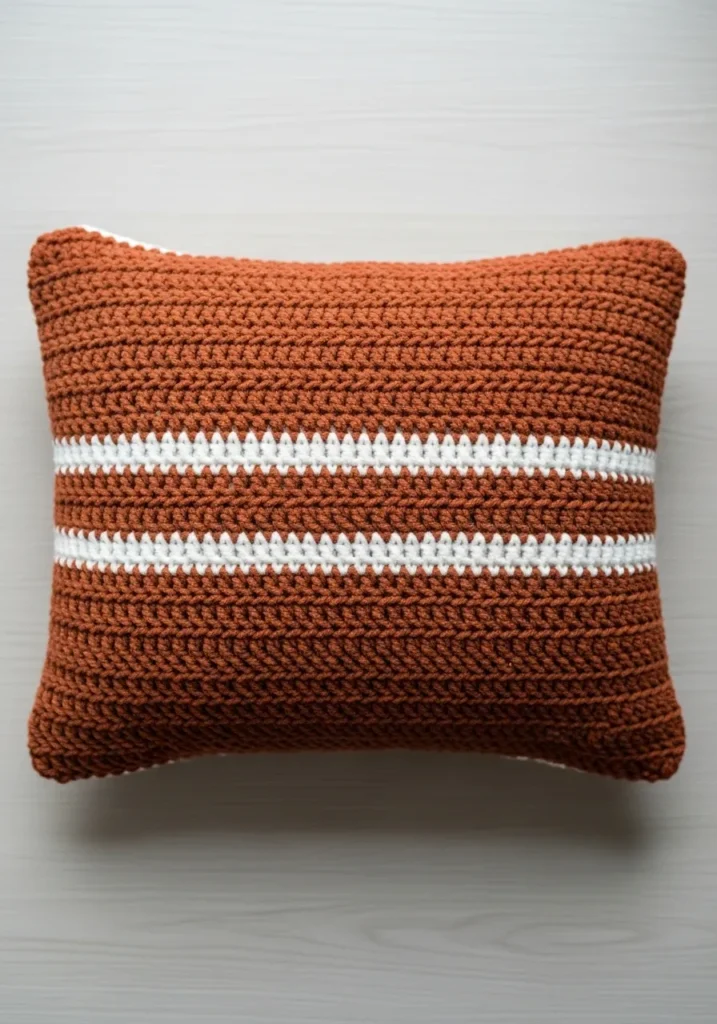 This cozy cushion is stitched in a stunning burnt orange yarn that brings a warm and inviting feel to any living room sofa. The design features two crisp white stripes running through the center, which adds a clean and modern touch to the rustic base color. Its texture is beautifully defined by a repetitive horizontal stitch that gives the fabric a slightly ribbed and very sturdy finish. The rectangular shape is plump and well-stuffed, making it a perfect functional accent piece for a reading nook or a favorite armchair.