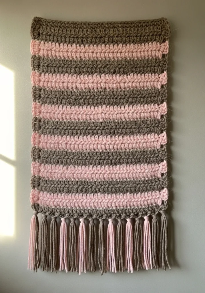 This stunning wall hanging features a rhythmic alternating pattern of dusty rose and warm taupe stripes that create a soothing visual flow. The stitches have a wonderful raised texture, which gives the piece a thick and high-quality feel against the wall. To finish it off, a row of long and thick fringe tassels in matching colors drapes elegantly from the bottom edge for that perfect bohemian touch. It is a beautiful way to add some soft textile art to a gallery wall or a bedroom space while keeping the color palette sophisticated and muted.