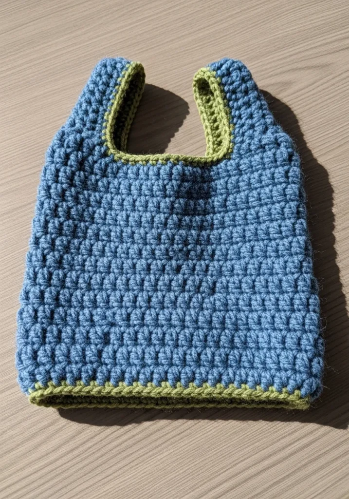 This sturdy little shopper is crocheted in a beautiful periwinkle blue yarn with a vibrant lime green trim along the handles and bottom edge. The body is worked in a chunky puff-like stitch that creates a thick and durable fabric to keep all your treasures safe inside. It features a classic open-top design with two integrated handles that make it easy to carry over your wrist or in your hand. The texture is wonderfully squishy and substantial, which gives it a high-end feel that is much more impressive than a flimsy plastic bag.