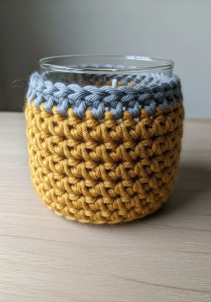 This cozy little sleeve is stitched in a rich mustard yellow yarn that brings a warm, glowing feel to any room. The top is finished with a few rounds of cool slate gray, creating a neat braided edge that hugs the rim of a glass candle jar. The main body is worked in a dense, crisscross-style stitch that provides a wonderful tactile grip and helps insulate the glass while adding a decorative, artisanal touch to your home decor.
