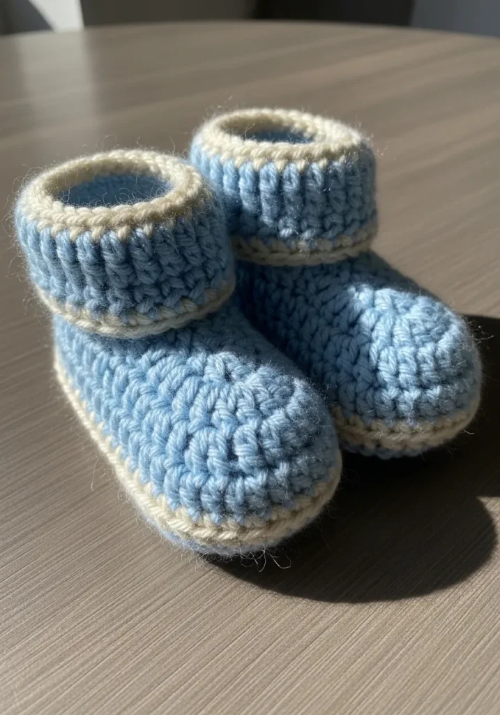 These precious little booties are crocheted in a soft, sky-blue yarn with delicate cream-colored accents around the soles and cuffs. The design features a tall, ribbed ankle cuff that can be folded down for a classic look or pulled up to keep tiny legs extra warm. The main body is worked in a dense, rounded stitch that provides a soft, cushioned environment for a baby’s feet, while the sturdy cream trim along the base gives the booties a nice structured shape.