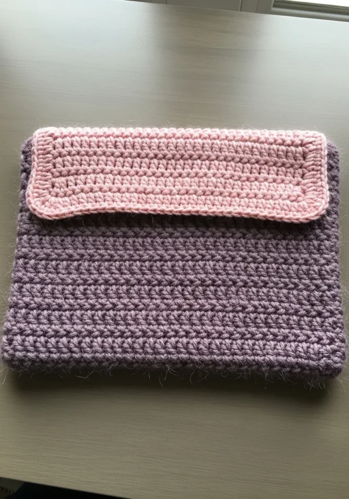 This sophisticated tech accessory is crafted from a deep, dusty plum yarn using a thick, horizontal ribbed stitch that offers plenty of padding for a device. The design is finished with a wide, rectangular flap in a soft rose pink that provides a secure closure across the top. The weave is exceptionally tight and dense, ensuring that a tablet stays protected from scratches or bumps while tucked inside a commuter bag or backpack. Its elegant, muted color palette gives it a professional yet handmade look that feels elevated and timeless.