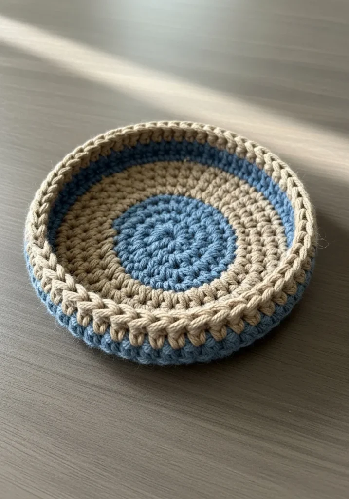 This charming little tray is crocheted using a mix of sandy beige and ocean blue yarn, creating a lovely coastal vibe. The center starts with a blue circle that transitions into a wide beige band, followed by a final pop of blue before finishing with a sturdy, ribbed beige rim. The stitches are worked very tightly in the round to give the sides enough structure to stand up on their own, making it a perfect catch-all for jewelry, keys, or crafting notions.