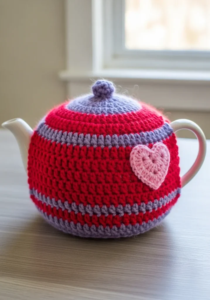 This charming teapot cover is worked in a vibrant cherry red yarn, featuring playful lavender stripes and a matching lavender top that perfectly fits around the lid. The cozy is finished with a sweet, light pink heart appliqué stitched onto the side, giving it a truly heartwarming and cottagecore feel. The body uses a thick, textured stitch that provides excellent insulation to keep a full pot of tea steaming hot while protecting your hands from the warm ceramic surface.