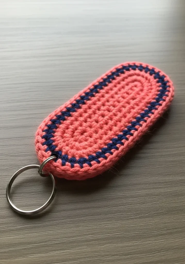 This dainty little accessory features a punchy watermelon pink yarn worked in a smooth oval shape with a contrasting navy blue border. The stitches are incredibly tight and uniform, which gives the fob a firm and durable structure that can survive the bottom of a messy purse. A simple silver split ring is securely attached to one end for holding keys or even hooking onto a backpack zipper. Its flat and compact profile makes it a sleek addition to any keychain without adding unnecessary bulk or weight.