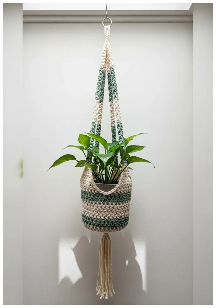 This boho-inspired plant holder features a lovely alternating pattern of sage green and sandy beige stripes that feel very earthy and fresh. The basket portion is worked in a chunky waffle-like stitch that creates a thick and supportive cradle for a favorite ceramic pot. Sturdy braided straps lead up to a sleek metal ring for hanging, while a long and playful tassel drapes from the bottom for extra movement. It has a wonderful organic texture that beautifully complements the glossy green leaves of a trailing vine or a leafy pothos.