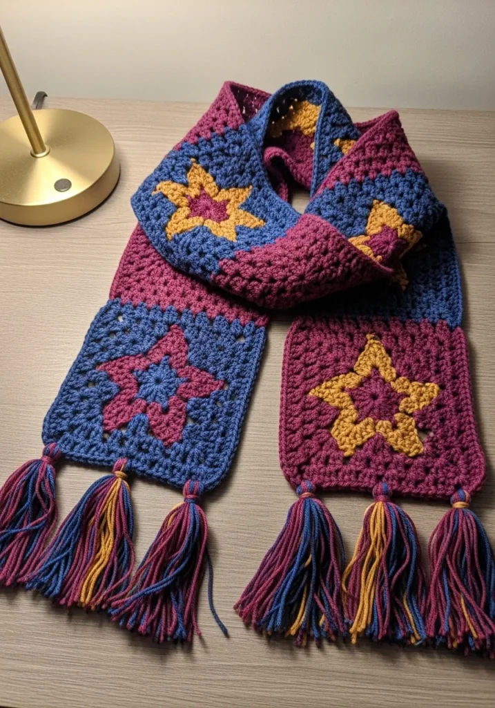 This crochet scarf is made from bold granny squares featuring bright star motifs in vibrant jewel tones. The squares are joined neatly, and the long fringe tassels at each end add movement and texture. The yarn choices create a playful contrast that feels both cozy and artistic.