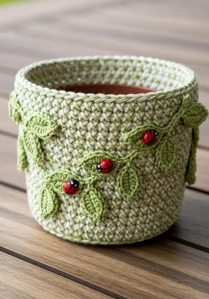 This crochet storage basket is worked in soft sage green yarn with textured leaf appliqués and tiny red berry accents wrapped around the sides. The cylindrical shape stands upright thanks to tight, sturdy stitches, and the decorative details give it a charming nature inspired feel. The overall design feels cozy yet functional.