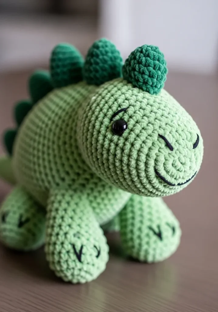 This crochet dinosaur plush is crafted in soft green yarn with rounded features, tiny stitched toes, and gentle textured spikes running along its back. The smooth amigurumi stitching gives it a clean finish, while the slightly oversized head makes it irresistibly cute. Its balanced proportions and soft stuffing create a polished, professional look.