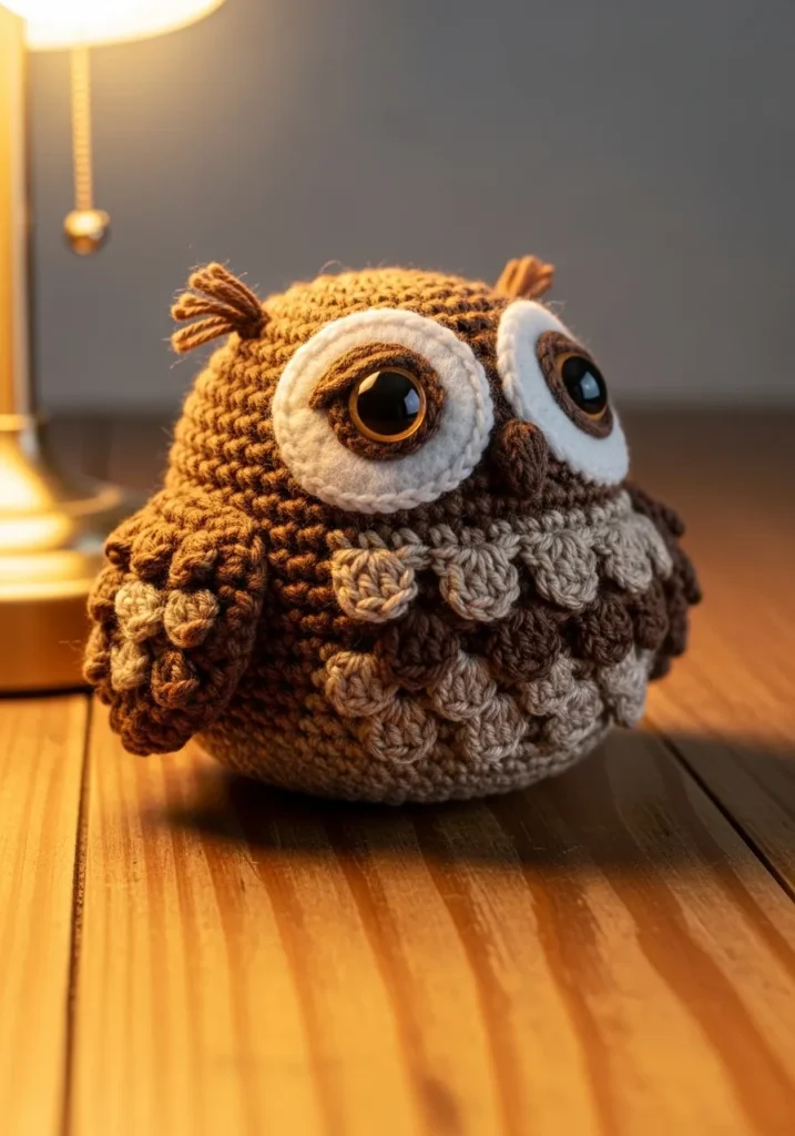 This crochet owl is full of charm with its round body, layered feather stitches in warm browns and creams, and oversized expressive eyes. The textured scallop details give the wings and chest beautiful dimension, while the tiny beak and neatly stitched features keep it polished and sweet. The tight amigurumi stitches create a sturdy, well shaped plush that looks both cozy and impressive sitting on a simple wooden surface.