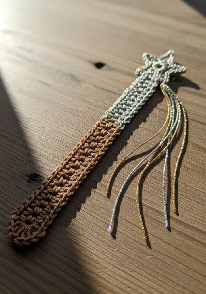 This crochet bookmark features a long, neatly stitched body in soft neutral yarn with a contrasting top detail and flowing tassel strands. The slim rectangular shape keeps it elegant, while the dangling fringe adds movement and texture. The stitches are even and structured, giving it a clean handmade finish that feels both practical and decorative.