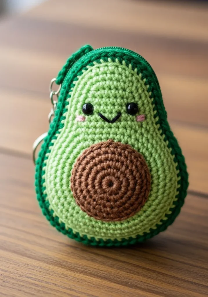 This crochet avocado plush is irresistibly cute with its bright green outer layer, soft lighter center, and textured brown pit detail. The rounded shape is smooth and balanced, and the tiny stitched smile gives it a friendly personality. The clean color transitions and tight stitching create a polished look that still feels playful.