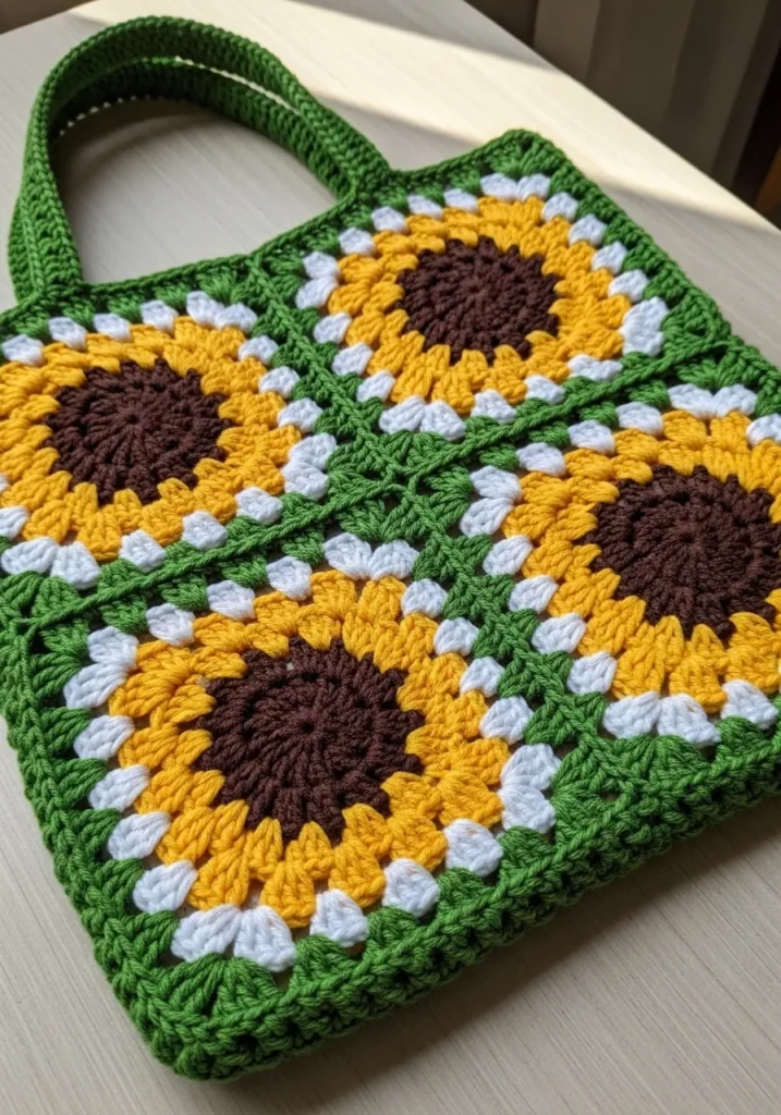 This crochet tote bag features four bold sunflower granny squares in rich shades of mustard yellow, deep brown, and leafy green. The textured petals radiate beautifully from the center, and the structured green borders frame each square with clean definition. The sturdy handles and tight stitching give the bag a practical feel, while the floral design keeps it cheerful and eye catching against a simple background.