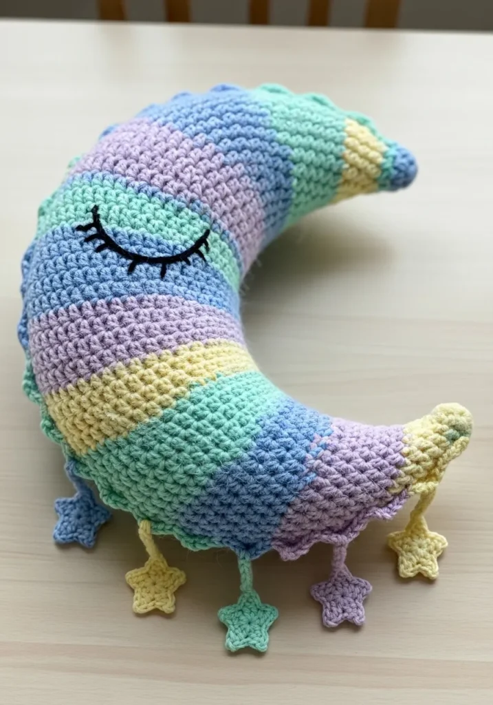 This dreamy crochet crescent moon pillow is worked in soft pastel stripes of lavender, mint, baby blue, and pale yellow. The curved shaping is smooth and balanced, and the embroidered closed eye adds a peaceful sleepy expression. Tiny dangling star charms along the bottom edge give it a whimsical celestial touch, while the plush texture makes it both decorative and cozy.