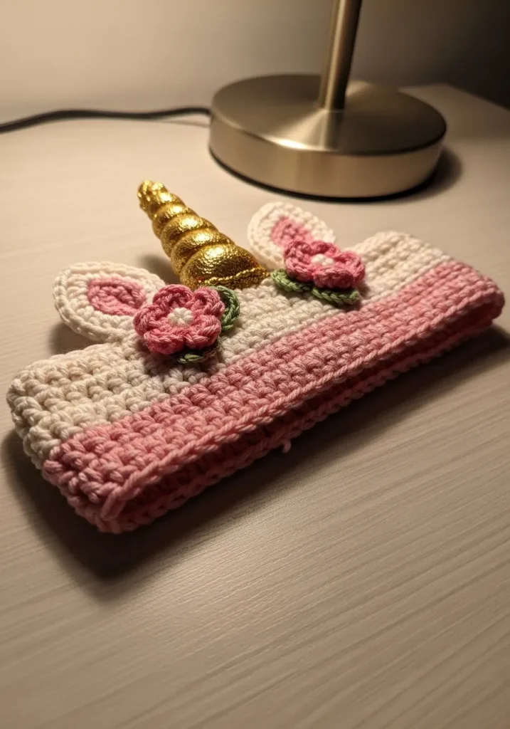 This crochet headband is pure magic with its soft cream base, blush pink band, and sparkling golden unicorn horn rising proudly at the center. The textured stitches give it a cozy, structured feel, while the delicate pink crochet flowers and tiny green leaves add a sweet handcrafted touch. The upright bunny style ears frame the horn beautifully, creating a playful silhouette that feels both charming and eye catching.