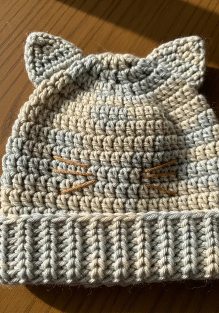 This crochet beanie features a soft neutral yarn with subtle ribbing along the brim and adorable pointed cat ears at the top. The textured stitches give it warmth and structure, while simple embroidered whiskers add a sweet playful detail. The shape is snug and slightly slouchy, making it both stylish and comfortable.