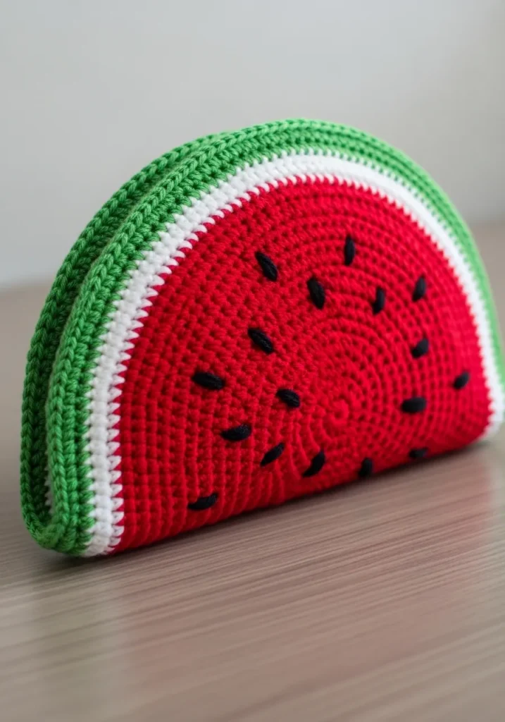This crochet clutch is shaped like a juicy watermelon wedge with bright red stitches, tiny black seed details, a crisp white stripe, and a bold green rind border. The half moon structure looks neat and structured, and the tight stitching keeps its shape beautifully. The vibrant contrast makes it stand out instantly against a simple setting.