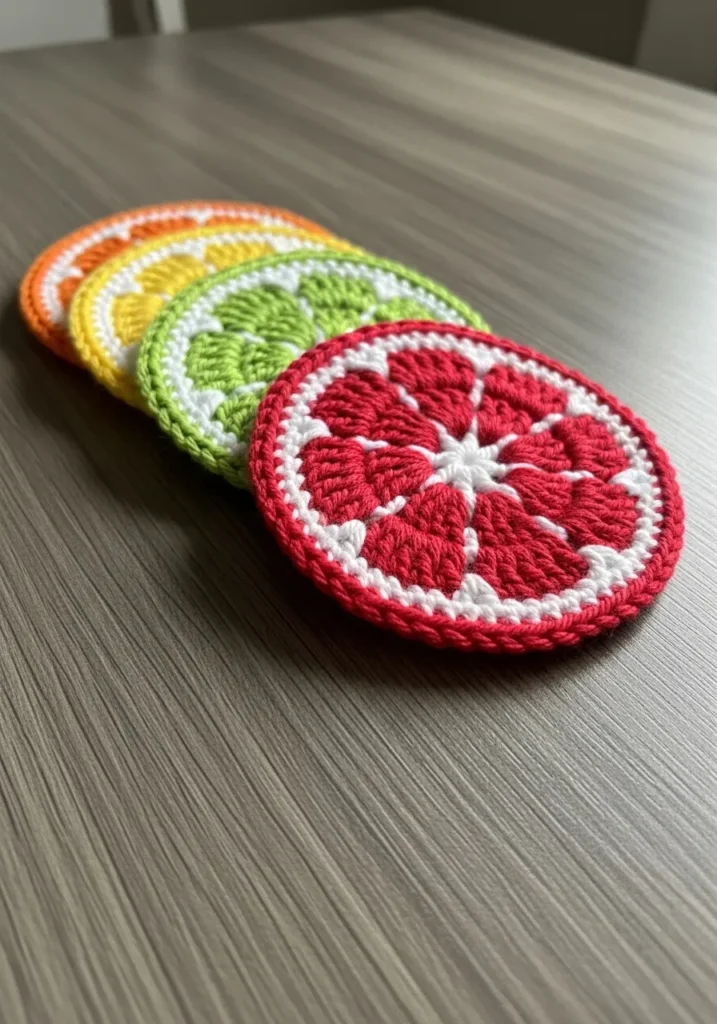 These crochet coasters are designed to look like colorful citrus slices in shades of orange, lemon yellow, and lime green. Each piece features textured segment lines and a crisp outer rind border that gives them a realistic fruit inspired look. The round shapes are smooth and evenly stitched, creating a neat and polished finish.