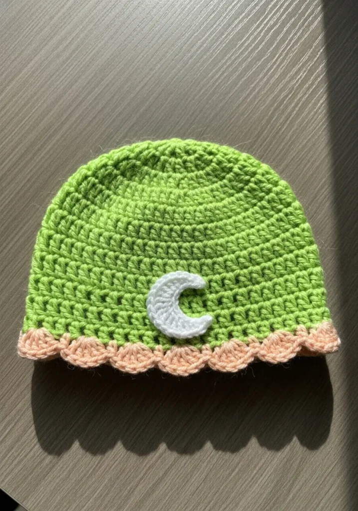 This zesty lime green hat features a whimsical white crescent moon applique right in the center for a touch of night sky magic. The bottom edge is finished with a delicate scalloped trim in a soft peachy pink, which creates a lovely, feminine contrast against the bright green body. It looks like it was made with a medium-weight acrylic yarn that offers a smooth texture and excellent stitch definition. The main body uses a classic double crochet stitch to keep it lightweight and comfortable for year-round wear, while the decorative border adds a bit of vintage flair.