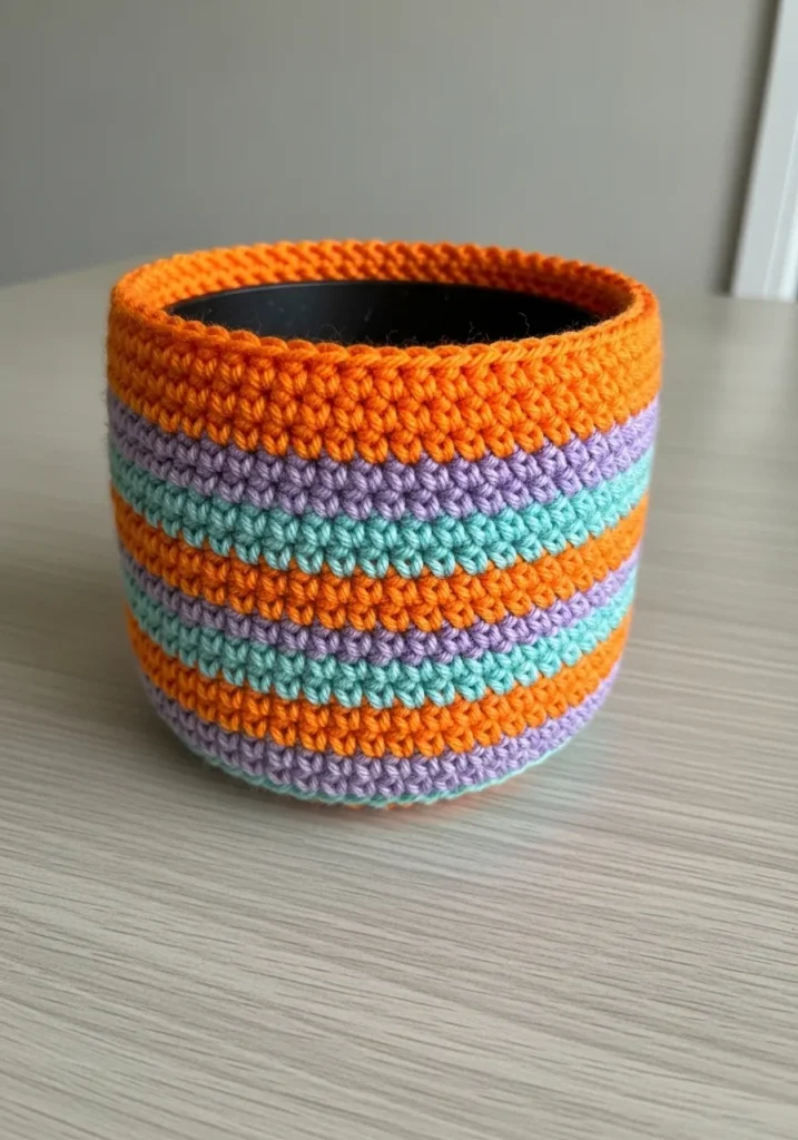 This cheerful basket cover features a bright orange rim that flows into alternating stripes of lavender and minty teal. It is designed to fit snugly over a standard plastic nursery pot, transforming something basic into a colorful home accessory. The crochet work is incredibly tight and uniform, using a sturdy cotton yarn that provides enough structure to stand upright on its own. The ribbed texture of the stitches adds a lovely depth to the stripes, making the colors look even more vibrant and playful sitting on a windowsill or desk.